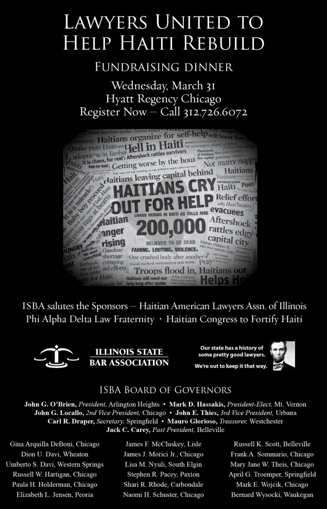 Register now for Lawyers United to Help Haiti Rebuild Wednesday, March 31 Hyatt Regency Chicago Register Now - Call 312.726.6072Posted on March 24, 2010 by Chris BonjeanFiled under: Events
