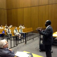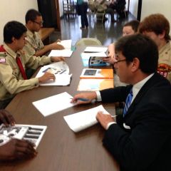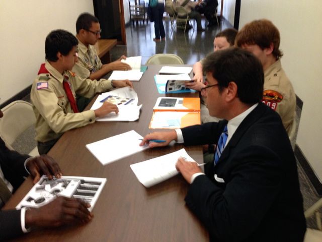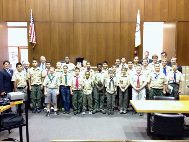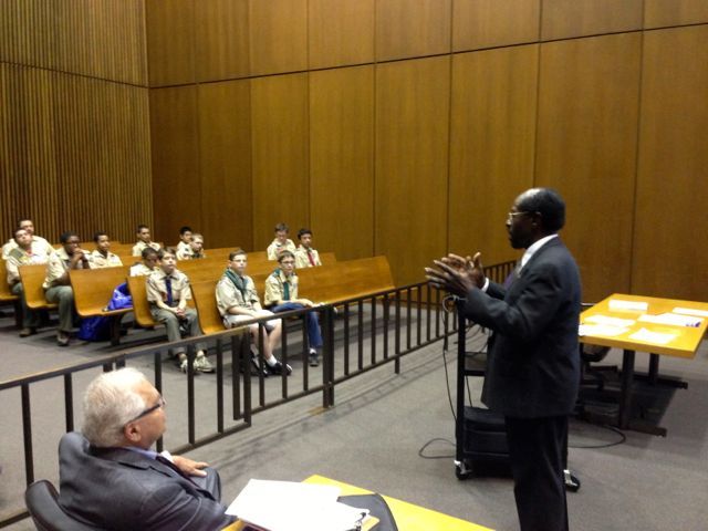 Nearly 30 Boy Scouts from 17 different troops of the Chicago Area Council earned their “Law” merit badge upon completing a day-long clinic offered by NESA CHICAGO in a courtroom of the Richard J. Daley Center on October 5, 2013. The panel was comprised of judges and attorneys from various backgrounds around the city, each of which are Eagle Scouts, including Judge Joseph D. Panarese (Associate Judge, 1st Municipal District Circuit Court of Cook County) and attorneys Howard L. Huntington (of Mahoney, Silverman & Cross, LLC), Lawrence Chesler (retired Sr. Vice-President of NAVTEQ Corporation), Benjamin M. Whipple (Director of Governmental Affairs at Boyd Gaming), Jonathan R. Sick (of McAndrews Held & Malloy), and Todd R. Plotner (of Chapman and Cutler LLP). An extra special addition to this year’s faculty was the Honorable E. Kenneth Wright, Jr., Presiding Judge of the First Municipal District of Cook County (the only non-Eagle Scout).
