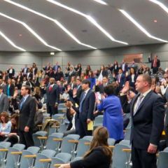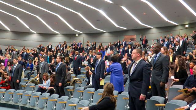 Justice Anne M. Burke presided over the 9 a.m. ceremony at the James R. Thompson Center Assembly Hall in Chicago. Guests of the morning ceremony included Randy K. Johnson, of the Illinois Board of Admissions; Umberto Davi, president of the Illinois State Bar Association; and Chung-Han Lee, president of the Asian American Bar Association. Justice Charles E. Freeman and Appellate Justice Cynthia Y. Cobbs presided over the 11:30 a.m. ceremony and Justice Mary Jane Theis presided over the 2:30 p.m. ceremony.