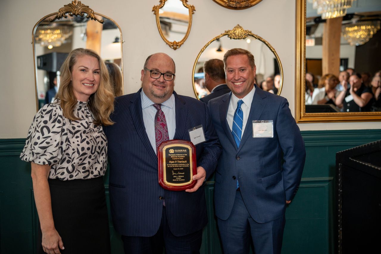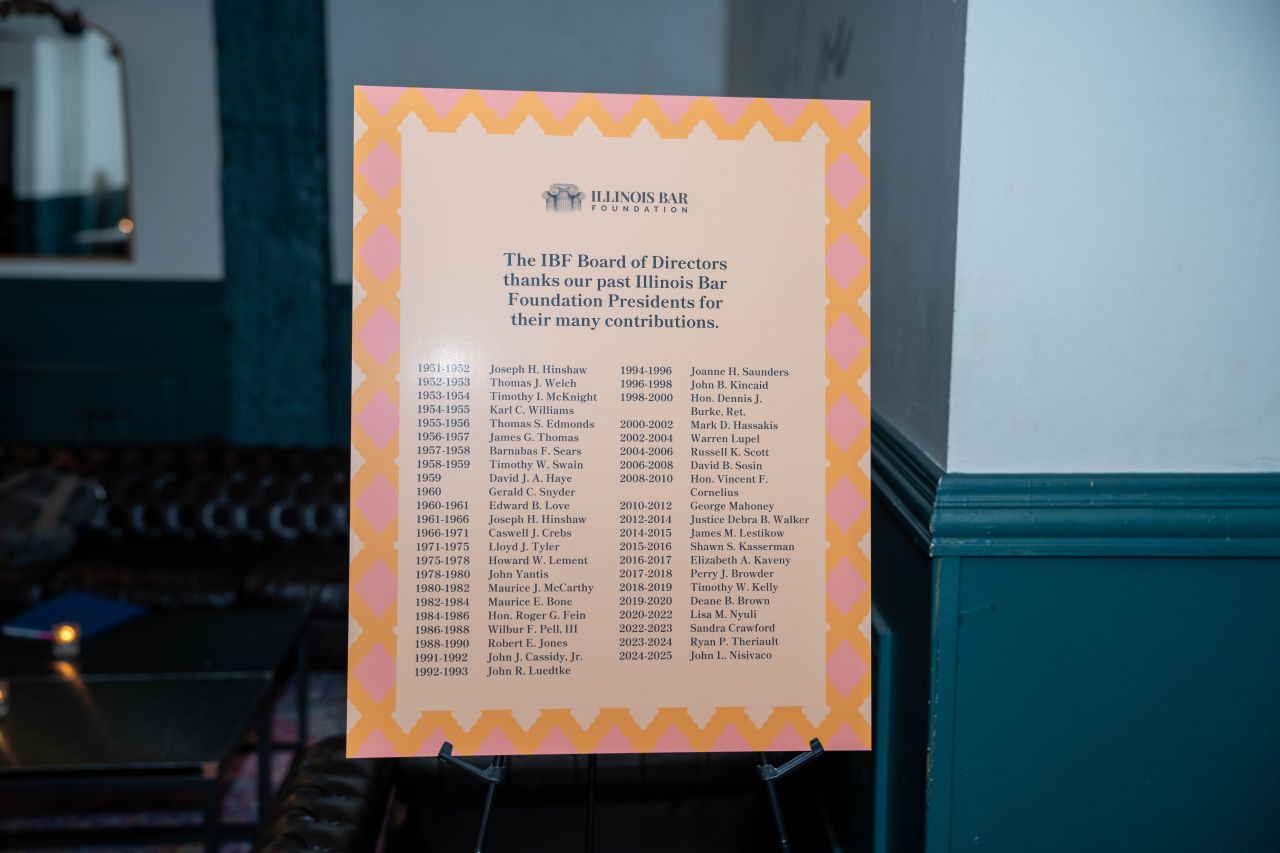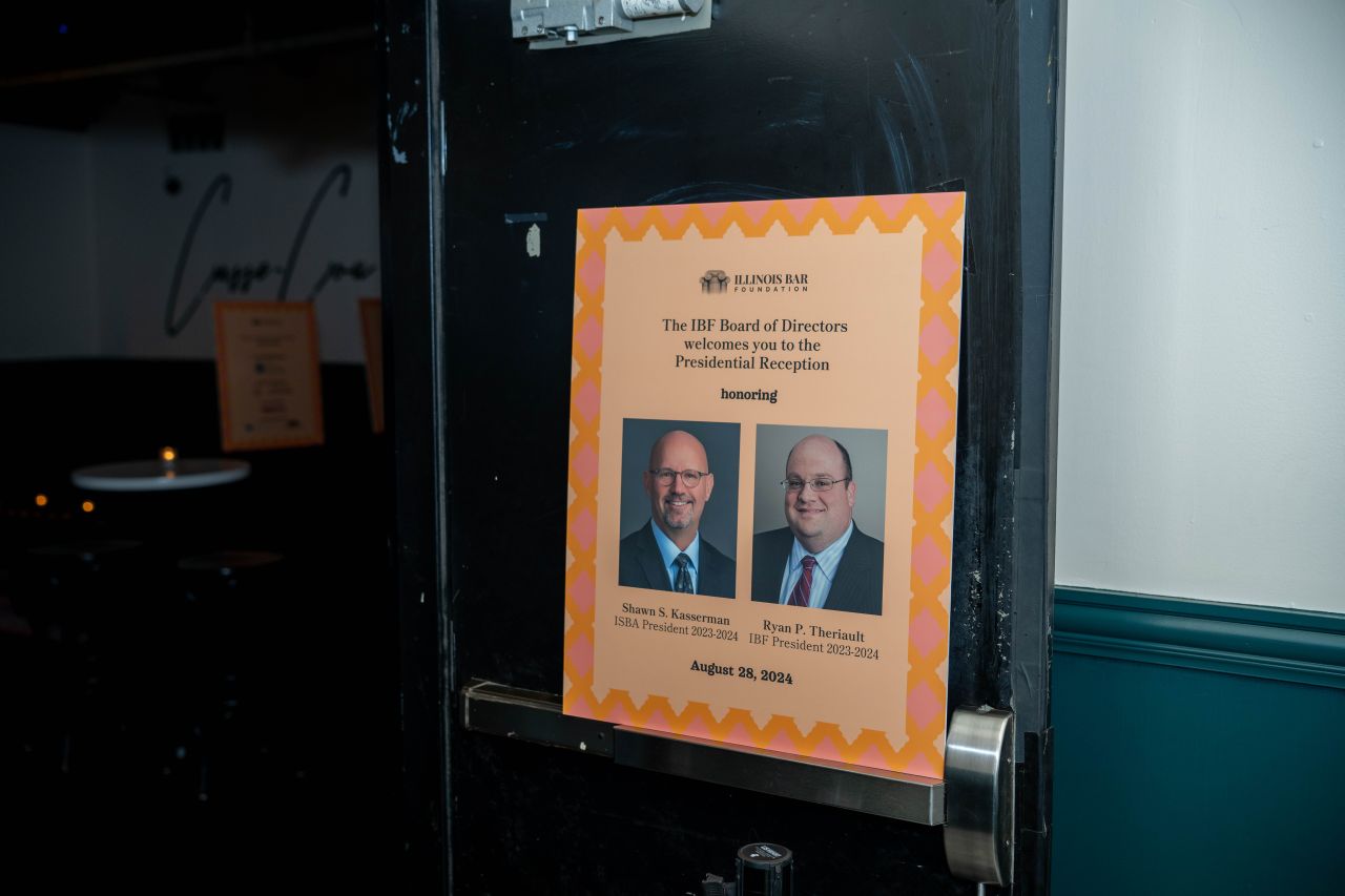 We honored ISBA President 2023-24, Shawn S. Kasserman, and IBF President 2023-24, Ryan P. Theriault, for their service to the Illinois State Bar Association, the Illinois Bar Foundation, and the legal community on Wednesday, August 28, 2024, at Hubbard Inn, 110 W Hubbard Street, Chicago.